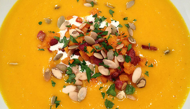 Lækker græskarsuppe med masser af græskar på toppen i form af stegte græskartern og græskarkerner. Suppen serveres med creme fraiche, persille og lidt bacon. Er du vegetar, undlades baconen selvfølgelig. Suppen er rigeligt mættende uden. Steg da de små græskartern i olie i stedet for baconfedt.