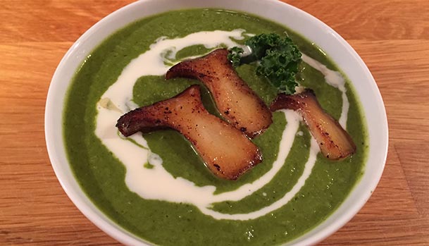 Grønkålssuppe med ærter er en lækker efterårs- og vintersuppe med masser fylde og den smukkeste grønne farve. Serveret med ristede kejserhatte, lidt fed creme fraiche og et godt brød, er suppen et lille kunstværk og en rigtig fin måde at spise grønkål på.