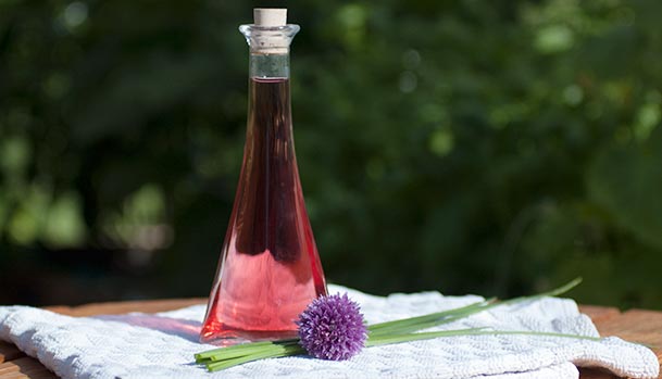 Kryddereddike på purløgsblomster har den smukkeste røde farve og en duft af purløg. Den passer rigtigt godt til dressinger og marinader, f.eks. i en olie-eddike baseret kartoffelsalat eller salater lavet på korn, ris eller pasta, hvor du ønsker en fyldigere eddikesmag.