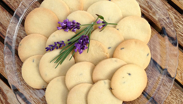Kunsten var at få brugt den meget parfumerede smag, uden den blev overvældende. Resultatet blev disse sprøde småkager, der har mørdejens bløde og smøragtige smag men med en tone af lavendel. Bider man i en blomst er smagen stærkere.